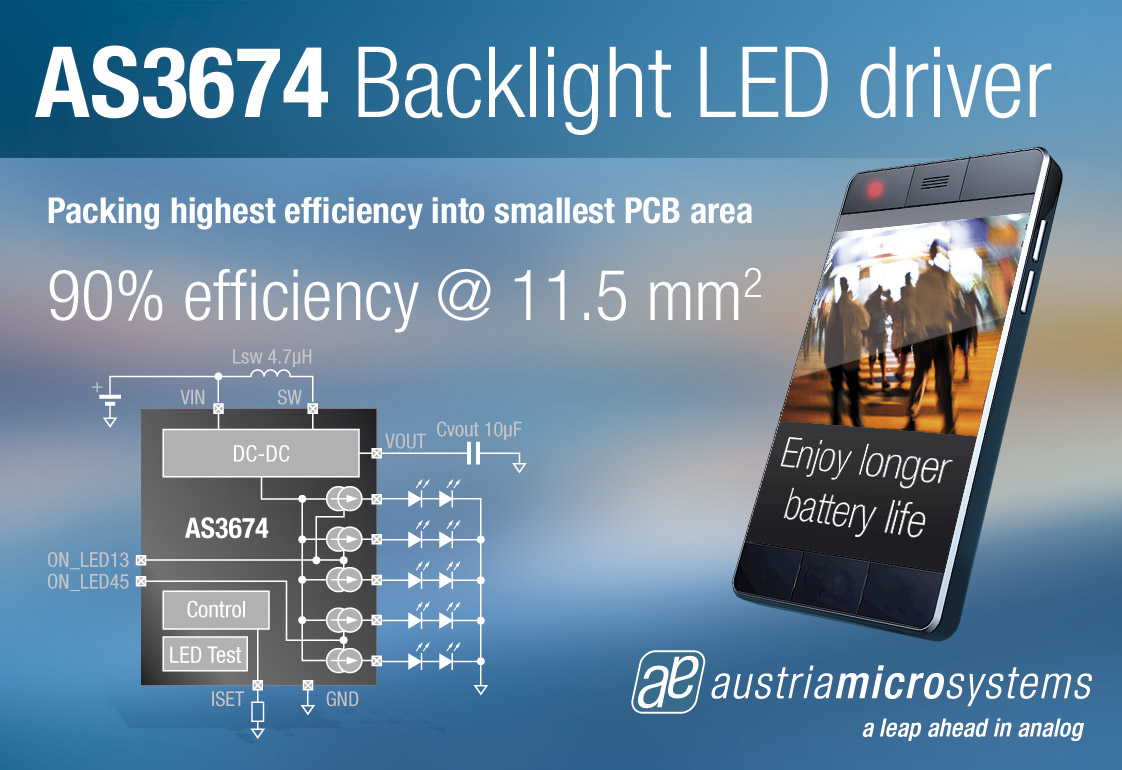 全球領(lǐng)先的高性能模擬IC設(shè)計(jì)者及制造商奧地利微電子公司(SIX股票代碼:AMS)宣布推出應(yīng)用于智能手機(jī)LCD顯示屏的AS3674及AS3490兩款LED背光燈驅(qū)動器芯片。新品具有業(yè)內(nèi)最高效能,峰值可達(dá)90%,包括DC-DC轉(zhuǎn)換器和電流源。PCB封裝僅為11.5 mm2 ,并只需4個(gè)外接組件。AS3674及AS3490非常適合應(yīng)用于智能手機(jī)和其他將空間列為首要需求的移動設(shè)備。