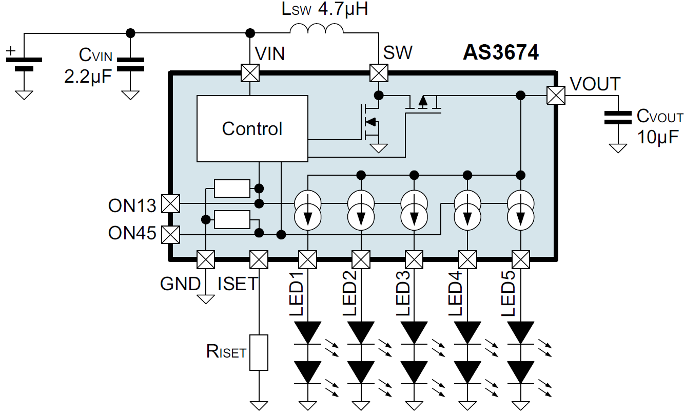 軟啟動的特點(diǎn)使AS3674更容易集成到對噪音敏感的無線射頻系統(tǒng)中。AS3674由兩組輸入電路控制,也可用介于100-800赫茲的PWM電路控制,實(shí)現(xiàn)1:2000的調(diào)光比。單通道兩個(gè)LED的配置結(jié)合2 MHz的轉(zhuǎn)換器操作頻率,實(shí)現(xiàn)使用諸如4.7µH電感的微小外部組件并取得優(yōu)于競爭對手最高達(dá)6%的高效率。