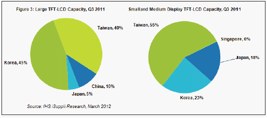 據(jù)IHS iSuppli公司的顯示材料與系統(tǒng)服務(wù),只有5%的大尺寸LCD面板產(chǎn)能和18%的中小LCD面板產(chǎn)能位于日本。