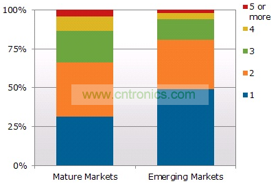該報(bào)告還發(fā)現(xiàn),在成熟市場(chǎng)家庭平均擁有2.4臺(tái)電視,而在新興市場(chǎng)平均每戶為1.8臺(tái)。成熟市場(chǎng)中,超過三分之二的家庭有一臺(tái)以上電視,但在新興市場(chǎng)近一半的家庭只有一臺(tái)電視。鑒于平板電視持續(xù)推出新機(jī)種、價(jià)格益加實(shí)惠、以及消費(fèi)者對(duì)高品質(zhì)、大屏幕和高清晰度電視的消費(fèi)欲望,和成熟市場(chǎng)的消費(fèi)者一樣,越來越多的新興市場(chǎng)消費(fèi)者購買平板電視(主要是液晶電視)來汰換他們現(xiàn)有的舊款式電視。