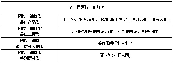 2013年6月9日,在廣州國際照明展覽會開幕式晚宴上,同時舉行了“阿拉丁神燈獎”大型頒獎盛典,現(xiàn)場宣布了評選的最終賽果,并頒發(fā)了相關(guān)的獎項。