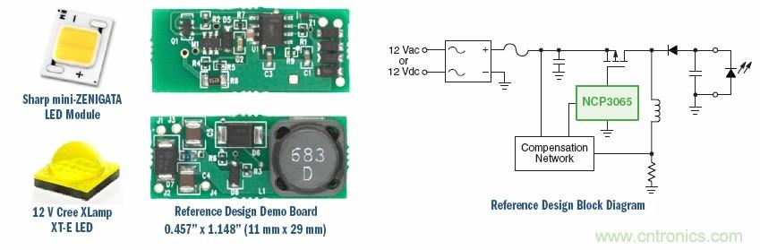 對于3至4個LED模塊的12 V AC-DC設(shè)計,可以使用安森美半導(dǎo)體針對NCP3065的評估板NCP3065BBGEVB,用來驅(qū)動12 Vac/Vdc應(yīng)用中的夏普ZENIGATA™、Cree XLamp™MC-E及其他LED模塊。其特點是小尺寸、寬輸入和輸出工作電壓,輸出電流經(jīng)過穩(wěn)流,還具有LED開路保護(hù)、輸出短路保護(hù)能力。該解決方案適用于MR16燈泡、景觀照明、交通照明。