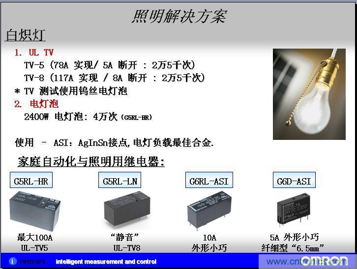 我們實(shí)際客戶應(yīng)用的案例,我們?cè)谕茝V客戶的過(guò)程中,形成了一些實(shí)際的應(yīng)用案例,在實(shí)現(xiàn)照明系統(tǒng)和家電自動(dòng)化的領(lǐng)域,在節(jié)能領(lǐng)域、自動(dòng)化的領(lǐng)域現(xiàn)在是越來(lái)越高了,目前歐姆龍的繼電器在日光燈這塊直接的應(yīng)用可以運(yùn)用繼電器作為啟用的電阻。繼電器也就是高級(jí)一點(diǎn)的器開(kāi)關(guān)。在模塊上面,也是用來(lái)控制鎮(zhèn)流器的。在另外一個(gè)人體、物體探照這塊,我們也會(huì)有MEMS非接觸系統(tǒng)的微溫度傳感器。按照設(shè)計(jì)的過(guò)程中,就是在信號(hào)繼電器和MEMS非接觸溫度傳感器繼電器上都有應(yīng)用,但是還沒(méi)有成功案例,所以上面就打了問(wèn)號(hào)。