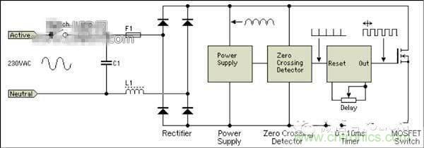 同樣,如圖所示,L1、C1起RF抑制作用。電路中有過(guò)零檢測(cè)和計(jì)時(shí)器,過(guò)零檢測(cè)到過(guò)零時(shí)重置計(jì)時(shí)器,且使計(jì)時(shí)器輸出高電壓,開(kāi)啟MOSFET,電路導(dǎo)通,計(jì)時(shí)器開(kāi)始計(jì)時(shí),經(jīng)過(guò)設(shè)定時(shí)間(ms,小于半周期)后,計(jì)時(shí)器輸出低電平,MOSFET關(guān)閉。電壓輸出中斷。