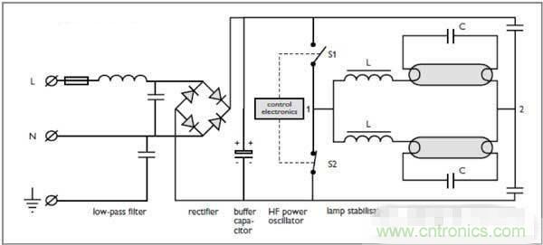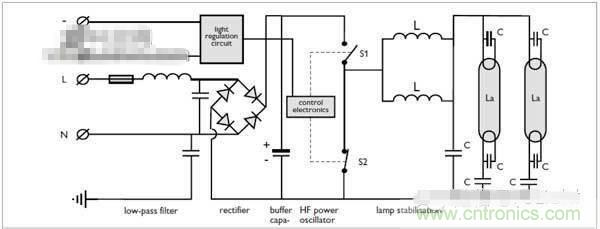 熒光燈的調(diào)光(1-10V)熒光燈的調(diào)光是在高頻電子鎮(zhèn)流器的基礎(chǔ)上研發(fā)出來(lái)的。下面是高頻電子鎮(zhèn)流器的線路圖: