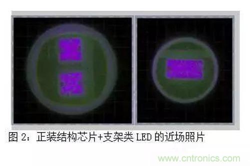 這類芯片廣泛被中低功率的封裝產品所采用,優(yōu)點是價格低;缺點是由于藍寶石導熱性能差,所以芯片散熱較差,P型材料的導電性也較差,因此注入電流受到限制。此外,芯片是五面發(fā)光的,通常需要將將芯片置于支架內,如圖2所示,反光杯的開口面積遠大于芯片發(fā)光面積,導致單位面積光通量低,芯片表面顏色均勻性非常差,芯片正上方偏藍,而外圈偏黃。這就是在使用中,如射燈、平板燈等,出現黃圈的原因。