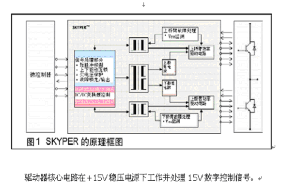 圖1是SKYPER驅動電路的原理框圖。該電路是一個半橋電路,它具備基本驅動電路所有的功能,如電勢隔離,保護功能如VCE監(jiān)測,短脈沖抑制,欠壓監(jiān)測以及死區(qū)時間。通過使用ASIC芯片以及基于基本驅動器功能的驅動器設計,它需要的元器件比傳統(tǒng)的驅動電路要少得多。