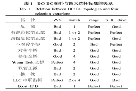 非隔離型的DC/DC 拓?fù)浣Y(jié)構(gòu)并不多,通常根據(jù)電壓的升降要求以及簡單性原則就可以比較容易確定最佳方案。 所以下面的標(biāo)準(zhǔn)主要是針對隔離型的DC/DC。 此外,標(biāo)準(zhǔn)的量化是建立在目前元器件的水平上。 隨著元器件的發(fā)展,這些標(biāo)準(zhǔn)的量化也是動態(tài)發(fā)展的;再者,電源輕小化是目前主流電源追求的重要指標(biāo),輕小化體現(xiàn)在電力電子線路上就是要求高頻化。 所以下面的標(biāo)準(zhǔn)也是建立在電源體積要盡量小的前提上。