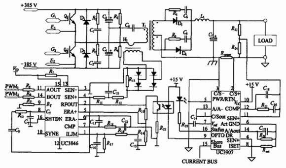 因為電源并聯在一起, 很難達到輸出電流分配均勻, 所以并聯電源模塊間必須采用均流措施。某DC/DC變換器要求: 輸入電壓為385V, 輸出電壓38V, 輸出電流為100A, 必要時多臺開關穩(wěn)壓電源可以直接并聯使用, 并聯使用時的負載不均衡度小于5%。DC/DC變換器主電路采用半橋式電路拓撲,控制芯片采用TI公司生產的電流控制型PWM集成控制芯片UC3846, 在比較幾種均流控制方案的基礎上, 選擇了根據最大電流自動均流法而設計的UC3907 均流控制芯片, 實現了并聯運行時均流控制。電源模塊在并聯時, 取得較好的均流效果。