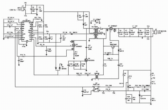 圖 3 顯示了傳統(tǒng)同步反向電源設(shè)計(jì)的完整原理圖。該設(shè)計(jì)使用了一個(gè)低成本、簡(jiǎn)化的電流模式 PWM 控制器(即 UCC2809),對(duì)電源進(jìn)行控制。除了主緩沖器以外,該電路還需要D3 和 D4 的齊納鉗位電路,以防止來(lái)自漏極電感峰值的 Q1 超高柵-源電壓。
