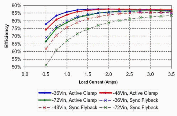 有源鉗位所提供的所有這些小小的改進(jìn)都會(huì)對(duì)效率產(chǎn)生很大的影響。圖 7 顯示了在最小、額定及最大輸入電壓值時(shí)測(cè)量得出的兩種設(shè)計(jì)的效率。在所有線電壓情況下,有源鉗位設(shè)計(jì)將最大負(fù)載效率提高了 2% 左右。在輕負(fù)載的情況下,這種區(qū)別更位明顯。額定線電壓及輕負(fù)載情況下,效率提升超過(guò)了 12%,這對(duì)于長(zhǎng)時(shí)間處于空閑模式的系統(tǒng)來(lái)說(shuō)是很重要的。大部分效率提升都來(lái)自漏極電感能量的恢復(fù),漏極電感能量耗散通常發(fā)生在緩沖器中,并減少了同步 FET Q1 直通帶來(lái)的損耗。