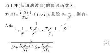 在壓控振蕩器中,因頻率可以是變量,故它們不是簡單的乘以時(shí)間的關(guān)系,而是對(duì)時(shí)間的積分。除壓控振蕩器的積分作用外,濾波器環(huán)節(jié)中還需有積分項(xiàng),這樣才可以使ud的直流成分穩(wěn)定為0,從而θ-θ0的差可以穩(wěn)定為π/2。uc的值由濾波器中的積分項(xiàng)保持作用維持。另外,濾波器中若只有積分項(xiàng),將出現(xiàn)等幅振蕩,故需要增加一個(gè)比例項(xiàng)。其數(shù)學(xué)模型如圖3所示。