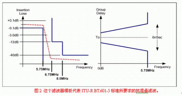 抗混疊濾波器:這一類器件被放置在ADC之前,用來衰減信號中Nyquist頻率以上的成分,即高于ADC采樣率一半的信號分量。這些濾波器頻率響應的過渡帶通常都設計得盡可能陡,目的是盡可能將截止頻率以上的信號統(tǒng)統(tǒng)濾掉。對ITU-601以及其他應用來說,這樣的性能是通過將模擬濾波器、數字濾波器以及過采樣ADC結合運用來實現的。而對PC圖像之類的應用,少量的濾波就足夠了。