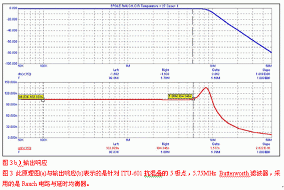 圖1中的群延時曲線在截止頻率處出現了一個峰。這是由截止頻率附近陡峭的相位變化造成的。為了有一個大致的概念,以一個3極點、6MHz Butterworth濾波器為例,在其帶寬范圍內群延時差異大約為20ns-25ns。增加極點數或濾波器的選擇性會使該差異增加。其他一些用來減小群延時差異的更特殊的濾波器包括Bessel、相位逼近、Thompson-Butterworth,以及LeGendre等。盡管如此,在視頻中最常使用的仍然是Butterworth特性的濾波器。