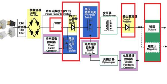 能效規(guī)范對(duì)電路段的挑戰(zhàn)主要體現(xiàn)在PFC能效、主轉(zhuǎn)換器能效和次級(jí)能效幾個(gè)方面。要提高這幾個(gè)方面的能效,就必須改善如圖1所示電路紅色框中的元件性能。以下將介紹改善電路段能效的幾種方法。