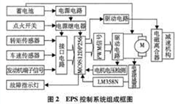 電動助力轉向系統(tǒng)的硬件電路主要包括以下模塊:MC9S12DP256微控制器、電源電路、信號處理電路、直流電機功率驅動模塊、故障診斷模塊與顯示模塊、車速傳感器、扭矩傳感器、發(fā)動機點火信號、電流及電流傳感器等接人處理電路,另外還有電磁離合器等,EPS系統(tǒng)的硬件邏輯框架如圖2所示。