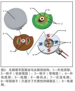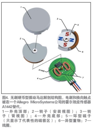 如前所述,無(wú)刷電機(jī)具有較長(zhǎng)的壽命,并由于產(chǎn)生的電火花較少,也沒有了RFI干擾。無(wú)刷直流(BLDC)設(shè)計(jì)還提供業(yè)內(nèi)直徑最小、厚度最薄的扁平振動(dòng)馬達(dá)。圖4介紹了這種馬達(dá)的基本構(gòu)造。
