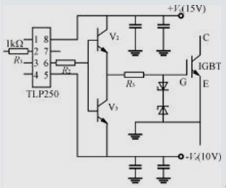 圖3為采用光耦合器等分立元器件構成的IGBT驅動電路。當輸入控制信號時,光耦VLC導通,晶體管V2截止,V3導通輸出+15V驅動電壓。當輸入控制信號為零時,VLC截止,V2、V4導通,輸出-10V電壓。+15V和-10V電源需靠近驅動電路,驅動電路輸出端及電源地端至IGBT柵極和發(fā)射極的引線應采用雙絞線,長度最好不超過0.5m。