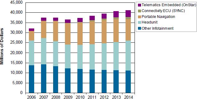 圖1:2006-2014年全球汽車信息娛樂系統(tǒng)銷售額預(yù)測(cè) (以百萬美元計(jì))