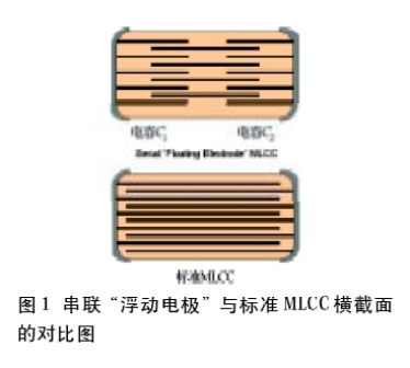 許多年前,人們發(fā)現(xiàn)在空氣中測試500VDC以上的電壓時,MLCC標準設計的性能出現(xiàn)了問題。有效層(active layer)之間的內(nèi)部擊穿和接線端之間的表面弧導致了故障的出現(xiàn)。為了解決電容器的有效區(qū)(active area)的電壓應力問題,制造商開發(fā)出了一種串聯(lián)“浮動電極”設計,在單個元件內(nèi)有效集成了2個以上的電容器組。圖1是這類設計與標準MLCC的比較。