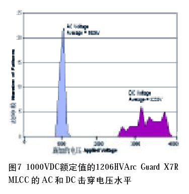 在許多應用中,AC電源處理以及承受AC電壓的能力至關(guān)重要。測量這種能力的一種典型方法是在各種高頻條件下施加AC紋波電壓,直到電容器增加到超過環(huán)境溫度20℃以上。不過,在X7R電容器與C0G(NP0)的電容器之間又一次出現(xiàn)了顯著的差異,前者的剩余電偶(remnant dipole)隨著施加的電場移動而引起發(fā)熱,而后者在這種情況下的溫度不會增加。另一個AC 能力指標是通過施加60Hz AC電壓,將其提升至6kV峰值30s 以上,直到發(fā)生電解質(zhì)擊穿而實現(xiàn)的。這種類型測試的結(jié)果可以與對1000VDC額定值的1206 X7R HVArc Guard電容器施加500Vdc/s的破壞測試的DC擊穿電壓相比,如圖7所示。D C 電壓故障的發(fā)生遠遠超過了1000VDC額定值。由于AC電壓故障發(fā)生在1000VAC左右,與DC電壓相比,故障的分布范圍很窄。