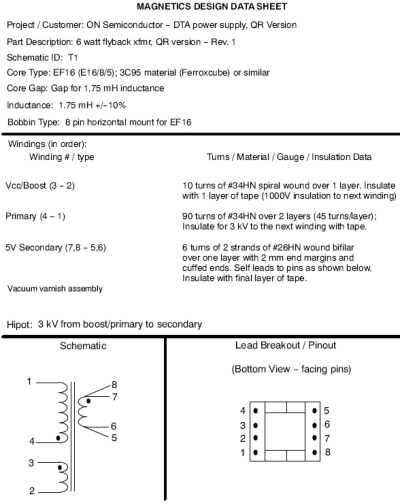 電流感測變壓器T2的設(shè)計(jì)并非最關(guān)鍵的事項(xiàng),可以采用任何匝數(shù)比在30:1至50:1的小型鐵芯就可以使用。然而,主反激變壓器T1的設(shè)計(jì)對(duì)能效及優(yōu)化電源性能而言非常關(guān)鍵。我們并不建議重新設(shè)計(jì)磁芯結(jié)構(gòu)更小(磁芯橫截面積Ae更小)的變壓器。使用橫截面積較大的磁芯可能使總匝數(shù)較少,并有可能增量提升能效,但為了恰當(dāng)?shù)碾娐饭ぷ?,需要維持規(guī)定的電感值。