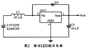 由于所選用的LED燈的額定電壓為3.3 V,而超級電容器的電壓為5.0 V,并且超級電容器在放電過程中電壓會不斷降低,因此需要有穩(wěn)壓電路來驅動LED。