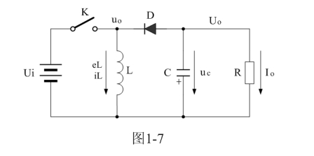 圖1-7中,Ui為輸入電源,K為控制開關(guān),L為儲能電感,D為整流二極管,C為儲能濾波電容,R為負(fù)載電阻。當(dāng)控制開關(guān)K接通的時候,輸入電源Ui開始對儲能電感L加電,流過儲能電感L的電流開始增加,同時電流在儲能電感中也要產(chǎn)生磁場;當(dāng)控制開關(guān)K由接通轉(zhuǎn)為關(guān)斷的時候,儲能電感會產(chǎn)生反電動勢,使電流繼續(xù)流動,并通過整流二極管D進(jìn)行整流,再經(jīng)電容儲能濾波,然后向負(fù)載R提供電流輸出??刂崎_關(guān)K不斷地反復(fù)接通和關(guān)斷過程,在負(fù)載R上就可以得到一個負(fù)極性的電壓輸出。