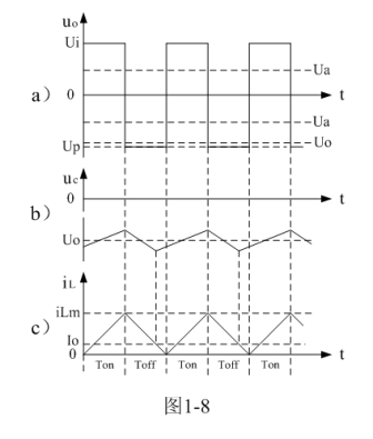 圖1-8、圖1-9、圖1-10分別是控制開關(guān)K的占空比D等于0.5、< 0.5、> 0.5時,圖1-7電路中幾個關(guān)鍵點的電壓和電流波形。圖1-8-a)、圖1-9-a)、圖1-10-a)分別為控制開關(guān)K輸出電壓uo的波形;圖1-8-b)、圖1-9-b)、圖1-10-b)分別為儲能濾波電容兩端電壓uc的波形;圖1-8-c)、圖1-9-c)、圖1-10-c)分別為流過儲能電感L電流iL的波形。應(yīng)該特別注意的是,圖1-8-c)、圖1-9-c)、圖1-10-c)中的電流波形按原理應(yīng)該取負(fù)值,但取負(fù)值后與前面圖1-5與圖1-6對比反而覺得不好對比和分析,因此,當(dāng)進(jìn)行具體計算時,一定要注意電流和電壓的方向。[page]