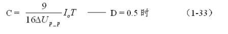 (1-33)和(1-34)式,就是計算反轉(zhuǎn)式串聯(lián)開關(guān)電源儲能濾波電容的公式(D = 0.5時)。式中:Io是流過負(fù)載電流的平均值,T為開關(guān)工作周期,ΔUP-P為濾波輸出電壓的波紋,或電壓紋波。一般波紋電壓都是取電壓增量的峰-峰值,因此,當(dāng)D = 0.5時,波紋電壓等于電容器充電的電壓增量,即:ΔUP-P = 2ΔUc 。