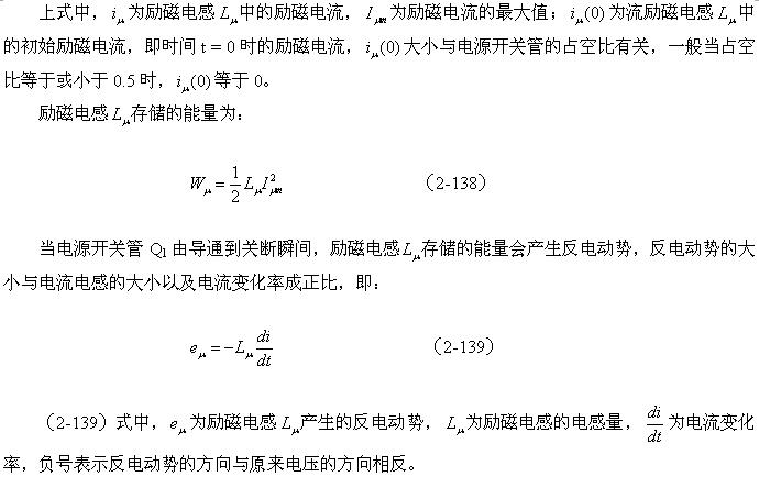(2-140)式對(duì)于計(jì)算漏感 產(chǎn)生的反電動(dòng)勢(shì)或其它電感產(chǎn)生的反電動(dòng)勢(shì)同樣有效。漏感 中存儲(chǔ)的能量可根據(jù)(2-138)式求得;而流過漏感 的電流,對(duì)于反激式開關(guān)電源:可認(rèn)為與勵(lì)磁電流的大小基本相等,因?yàn)?,在反激式開關(guān)電源中,等效負(fù)載電阻等于無限大;對(duì)于正激式開關(guān)電源:可認(rèn)為與流過等效負(fù)載電阻的電流大小基本相等,因?yàn)?,在正激式開關(guān)電源中,勵(lì)磁電流相對(duì)于流過等效負(fù)載電阻的電流,很小。
