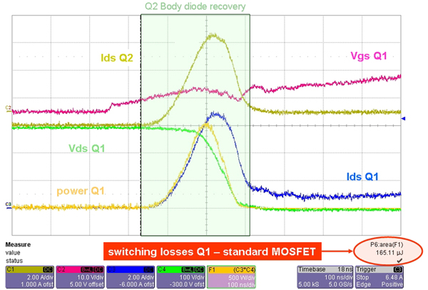 我們對比測試了標(biāo)準(zhǔn)的MOSFET和快恢復(fù)MOSFET。ST推出的STD5NK52ZD(SuperFREDmesh系列)放在Q2(LF)中,如圖4b所示。在Q1MOSFET(HF)的導(dǎo)通工作期間,開關(guān)損耗降低了65%。采用STD5NK52ZD時(shí)效率和熱性能獲得很大提升(在不采用散熱器的自由流動(dòng)空氣環(huán)境下,殼溫從60°C降低到50°C)。在這種拓?fù)渲?,MOSFET內(nèi)部的體二極管用作續(xù)流二極管,采用具有快速體二極管恢復(fù)特性MOSFET更為合適。