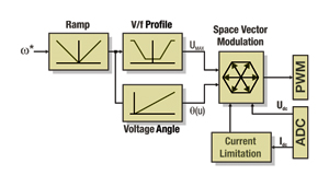 電機(jī)控制策略在交流單相感應(yīng)電動(dòng)機(jī)的調(diào)速驅(qū)動(dòng)中,開(kāi)環(huán)標(biāo)量控制是最普遍的控制策略。圖2描述了電機(jī)驅(qū)動(dòng)頻率的標(biāo)量控制,電壓的幅度與頻率成比例。這種技術(shù)需要能夠?qū)β蔬M(jìn)行適當(dāng)?shù)挠?jì)算,并能夠被8位微控制器所處理。