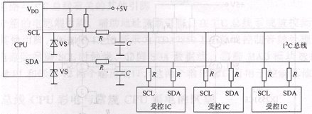 直接式I2C總線是指被控集成電路直接或通過電阻掛在I2C總線上,其電路工作原理圖如圖4所示。因為CPU的I2C總線輸出端口內(nèi)部電路形式為集電極開路(或漏極開路)形式,所以在CPU的I2C總線輸出端必須通過上拉電阻R接+5V電源,為CPU的I2C總線輸出端口的內(nèi)部電路供電。圖4中的電阻R為隔離電阻,C為抗干擾電容,主要是為了提高I2C總線上數(shù)據(jù)傳輸?shù)目煽啃裕乐拐`動作進(jìn)人維修狀態(tài)和防止由于外部干擾信號改變I2C總線數(shù)據(jù)。穩(wěn)壓管VS是為了防止外部高電壓損壞CPU的I2C總線輸出端的內(nèi)部電路。