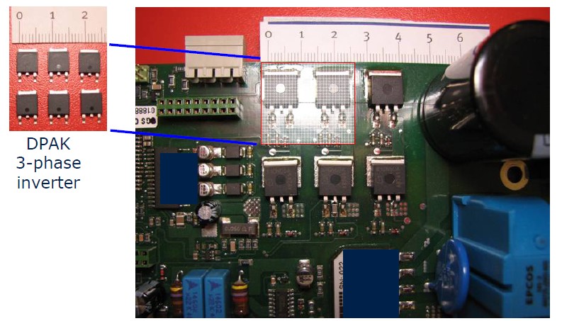 這是一個實際的PCP板上的IGBT的圖,我們看到如果用D2PARK的話,它兩顆的面積大概在2.5厘米,而如果使用DPARK封裝的話可以減少到1.5厘米左右,同時它跟IGBT模塊來相比的話可以節(jié)省0.5個美金的成本,所以對于一些消費類市場低成本的產(chǎn)品這個相當(dāng)重要的。