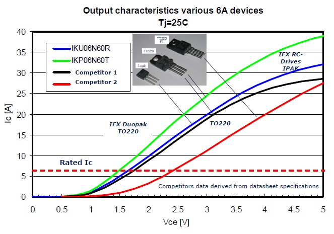 總結(jié)一下IGBT的重要特點,一個是成本,因為它采用的是一個晶圓,所以它的成本有很大的優(yōu)勢;另外因為減少了它的封裝,可以給PCB留下更多的空間,進(jìn)一步提高產(chǎn)品的功率密度。同時它也有一個非常好的性能,非常低的飽和導(dǎo)通壓降,一個非常軟的開關(guān)特性對EMI非常有幫助,它還有一個很好的溫度特性,最高溫度可以達(dá)到175度。藍(lán)色曲線是逆向?qū)ㄐ虸GBT和目前TO220封裝的飽和導(dǎo)通壓降的比較。這是用一個6安的產(chǎn)品在做比較,當(dāng)這個電流在6安的時候可以看到飽和導(dǎo)通壓降非常的低。