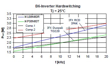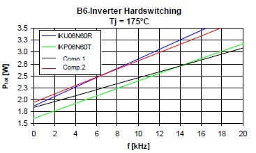 這個是25度損耗的時候,這個是175度損耗的時候,可以看到藍(lán)色的這根線,基本上它的損耗跟這個TO220封裝產(chǎn)品相差并不是很大。這個是在基于剛才基礎(chǔ)上做的一個損耗分析,首先頻率在4K赫茲的時候可以看到,這個淺藍(lán)色的就是二極管的開關(guān)損耗,這個是二極管的導(dǎo)通損耗,這個是IGBT的開關(guān)損耗,這個是IGBT的導(dǎo)通損耗??梢钥吹皆?K的情況下導(dǎo)通損耗這一部分和這一部分是占了絕對支配地位的。所以對于一個低頻應(yīng)用來說減少它的飽和導(dǎo)通壓降對于IGBT是相當(dāng)?shù)闹匾?dāng)它的頻率升高的時候,它的開關(guān)損耗就會稍微升高一點。