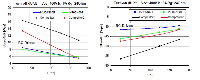 再加上不同的驅(qū)動電阻,這個時候我們也對dV/dt進(jìn)行了一個測試,然后可以看到基本上我們的dV/dt都比我們的競爭對手或者市面上的產(chǎn)品會優(yōu)異很多。因為減少IGBT的dV/dt的話可以減少前級的EMI濾波器的要求,同樣也可以減少成本,所以這個產(chǎn)品不僅在本身的價格上面有優(yōu)勢,同樣也可以整體的減少系統(tǒng)的成本。