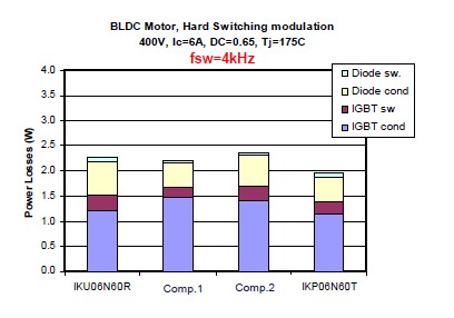衡量一個IGBT的好壞有兩個非常重要的指標(biāo),一個就是它的飽和導(dǎo)通壓降,就是Vce(sat),另外一個就是開關(guān)損耗,也就是Eoff。對于低頻的應(yīng)用來說,飽和導(dǎo)通壓降是占有絕對支配地位的,所以選擇這種RC-Drives的IGBT會是一個非常好的選擇,因為可以看到這種RC-Drives IGBT的飽和導(dǎo)通壓降是遠(yuǎn)遠(yuǎn)低于市面上的一些產(chǎn)品。這個是在一個無刷電機(jī)上面的損耗的分析。