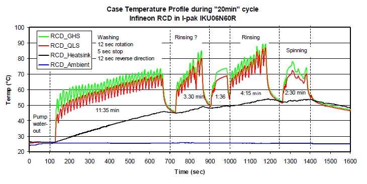 同時跟這種TO220的封裝的IGBT也做了一個溫度的比較,我們會發(fā)現(xiàn)TO220封裝的IGBT溫度會比逆向?qū)ㄐ虸GBT會低10度到15度,但是這個對于IGBT沒有任何影響。為什么呢?因為通常這種TO220的封裝的IGBT最高結(jié)溫是150度,而逆向?qū)ㄐ虸GBT是175度,所以它實際能力還是比這個要高,這是這種逆向?qū)ㄐ虸GBT的優(yōu)勢。為了進(jìn)一步來確認(rèn)一下這個溫度的應(yīng)力,然后我們把這個測試放在一個密閉的環(huán)境當(dāng)中再來看它的表現(xiàn),就是說我們來開動洗衣機(jī)使它的環(huán)境溫度平衡在40度這個環(huán)境上,就是從25度上升到40度,然后再來檢測IGBT的溫度,我們?nèi)匀豢梢园l(fā)現(xiàn)基本上它的最高溫度仍然沒有超過90度,所以對于一個結(jié)溫在175度的情況下,它有一個相當(dāng)大的裕量。