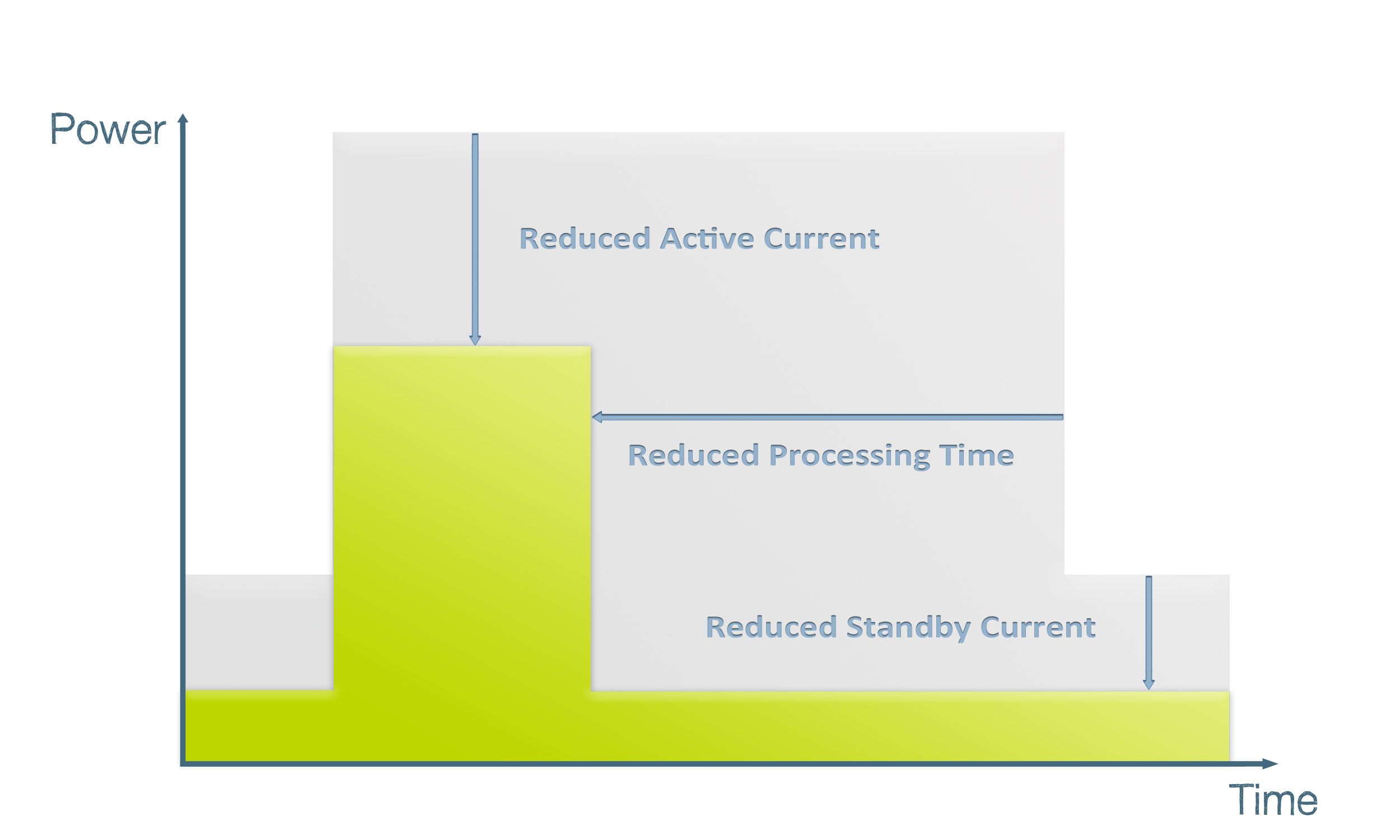 圖2. 一個節(jié)能MCU內(nèi)核可通過完整的喚醒/操作/返回睡眠周期節(jié)省幾個不同區(qū)域的能量。藍(lán)色區(qū)域表示一個更強(qiáng)大的32位內(nèi)核完成任務(wù)所節(jié)省的能量,所需的周期比一個8位內(nèi)核需要的少,在活躍和睡眠模式下消耗的電流也較少。