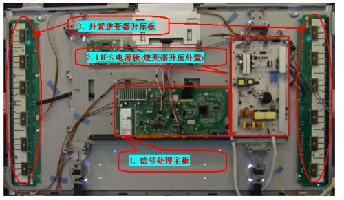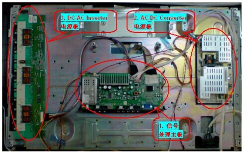 圖2:傳統(tǒng)式LCDTV內(nèi)置信號處理、AC/DC電源、DC/AC電源三塊PCB板。