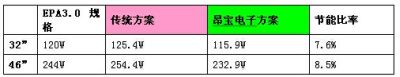 以某知名品牌32"與46"LCDTV進(jìn)行對比,昂寶電子所開發(fā)的LCDTV整體電源解決方案在整體功耗及關(guān)鍵零件數(shù)量方面均比傳統(tǒng)電源方案有明顯的優(yōu)勢:
