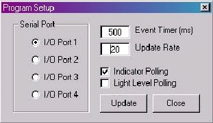 端口選擇、指示器和燈發(fā)光電平的輪詢、事件定時器、更新率選擇等。如圖3表示程序設(shè)置工作界面所示。