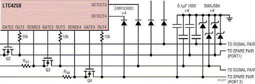 四對(duì)PD電路是最大的變化(圖4b)?,F(xiàn)在需要采用兩個(gè)LTC4257器件,電源電路必須具備足夠的智能,以便把從每一個(gè)通道吸取的電流限制在802.3af規(guī)范容許的范圍之內(nèi)。要做到這一點(diǎn),就要平衡從每一對(duì)線吸取的電流或平衡從每一對(duì)線吸取的功率,直到它接近(但是不超過)ICUT極限,然后,才從其它線對(duì)吸取電流。這種電路可能相當(dāng)復(fù)雜,不同的設(shè)計(jì)之間差異也很大。