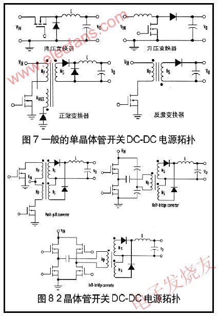 單晶體管拓?fù)?圖7),如降壓、升壓、正激、反激是在分布系統(tǒng)(高達(dá)100W)中設(shè)計(jì)用于相當(dāng)?shù)凸β守?fù)載的dc-dc變換器。降壓和升壓電路是非隔離的,而正激和反激變換器提供變壓器隔離。