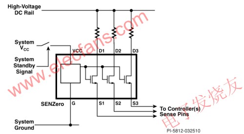 在消除市電輸入的電流消耗之后,接下來需要消除電路中的那些即使在待機狀態(tài)下也會連續(xù)消耗功率的其他元件的電流消耗。在較高功率應(yīng)用中,在高壓母線與功率因數(shù)校正(PFC)和DC/DC轉(zhuǎn)換器的電源控制器之間可能存在多條信號通路。例如包括PFC系統(tǒng)中連接升壓控制器的前饋或反饋信號通路,以及雙開關(guān)正向/LLC/半橋和全橋轉(zhuǎn)換器中的前饋信號通路。PI的第二款新產(chǎn)品是SENZero,它可以在不需要這些信號通路時將它們隔離,從而消除不必要的功率損耗。SENZero的典型應(yīng)用如圖4所示。