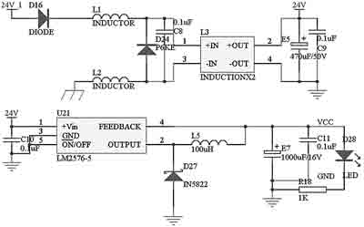本控制模塊的電源電路如圖2所示。車載蓄電池—發(fā)電機的電源從24V_1處進入,二極管D16主要是防止電源的正負極被誤接反。電感L1、L2對電源進行濾波,和共模電感L3、電容C8配合,可以過濾掉電源中的尖峰脈沖。二極管D24P6KE51A是脈沖干擾抑制器(TVS),它可以快速吸收超過額定電壓的尖峰脈沖,瞬時通過電流很大,最大功率可達500~1000W。電容E5和C9進一步對電源進行濾波。過濾干凈的電流通過開關電源芯片LM2576變換為系統使用的5V電源。電容E7和C11對輸出5V電源進行濾波,電阻R18和發(fā)光二極管D28指示當前是否有電。