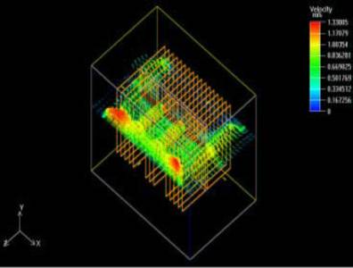 盡管散熱器的參數(shù)優(yōu)化對溫升控制略有改善,但仍不能滿足功率管的可靠性要求,因此,我們考慮強(qiáng)迫風(fēng)冷的散熱方式。在上述計(jì)算模型的基礎(chǔ)上,我們在垂直方向設(shè)定流體的流速為1.5m/s , 即在散熱器底部送風(fēng),其他參數(shù)不變。我們注意到,此時(shí)系統(tǒng)給出的流態(tài)為紊流。在初始條件中作相應(yīng)的調(diào)整后,最終求得的器件表面最高溫度約為89°C。散熱器底板截面溫度圖及橫向風(fēng)速云圖分別見圖2、3。