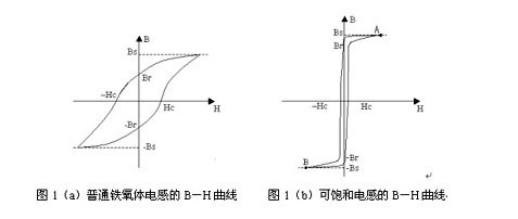 圖1(a)和圖1(b)分別是普通鐵氧體電感和可飽和電感的磁滯回線。從兩者的對(duì)比中可以明顯看出可飽和電感具有高磁滯回線矩形比(Br/Bs)、高起始磁導(dǎo)率mi、低矯頑力Hc、明顯的磁飽和點(diǎn)(A,B)等特怔。此外,由圖1(b)還可以看出,可飽和電感的磁滯回線所包圍的面積狹小,所以可飽和電感的高頻磁滯損耗相應(yīng)也較小。由于可飽和電感通常是由微晶、非晶、坡莫合金等鐵磁性材料制造的,所以可飽和電感一般都具有很高的起始磁導(dǎo)率mi和很高的飽和磁感應(yīng)